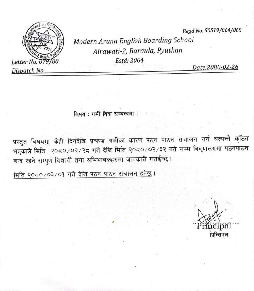 प्युठान, ऐरावती गाउँपालिका वडा नं २ बरौंला रहेको मोर्डन अरूना इङलिस बोर्डिङ स्कुलले केहीदिन देखि प्रचण्ड गर्मीका कारण पठनपाठन सञ्चालन गर्न अत्यन्तै कठिन भएकाले २०८० जेठ २८ गतेदेखि जेठ ३२ गतेसम्म बोर्डिङले बिदा दिएको छ । बोर्डिङले सामाजिक सञ्जाल मार्फत बिदाको सुचना सार्वजनिक गरेको छ ।