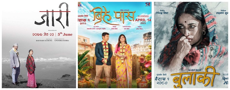काठमाण्डाै – नयाँ वर्षको अवसरमा तीन नेपाली चलचित्र एकसाथ प्रदर्शनमा आएका छन् । नयाँ वर्षको अवसरमा शुक्रवार आजदेखि ‘जारी’, ‘बुलाकी’ र ‘बिहे पास’ प्रदर्शनमा आएका हुन् । यसअघि ‘नाई नभन्नु ल–६’ पनि प्रदर्शन हुने भए पनि जाँचपास नभएपछि वैशाख १५ गतेका लागि नयाँ मिति तय गरेको छ ।